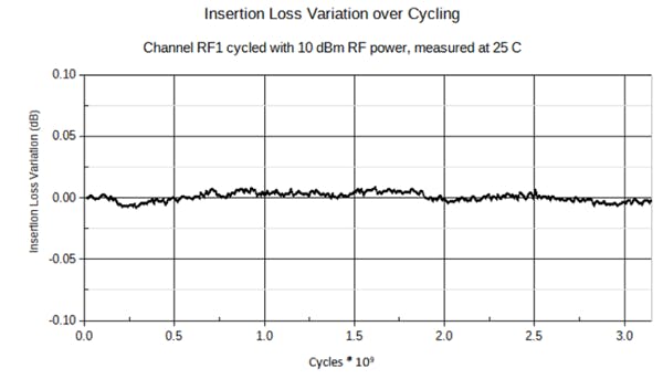 MEMS switches are based on breakthroughs in metal alloys that focus on minimizing metal fatigue. In fact, advances in alloys have effectively eliminated metal fatigue as a failure mechanism in the most advanced MEMS switches. The best of these devices can deliver stable performance after more than 3 billion on/off operations, a figure that soon will likely rise to more than 20 billion operations. Figure 1 shows highly stable insertion loss for more than 3 billion on/off cycles. In addition, some advanced switch designs can provide reliable operation when undergoing acceleration higher than 100 Gs.
