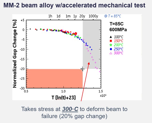 Another test was conducted to verify Menlo Micro switch performance during accelerated lifetime conditions for mechanical ruggedness (Fig. 3). A temperature of 300°C was required to deform the beam to failure, which shows that the Ideal Switch can deliver decades of operating life under these conditions.