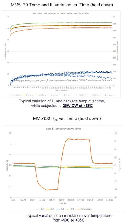 Another benefit realized by Menlo Micro’s approach is the ability of MEMS switches to offer high thermal performance in harsh operating environments with minimal variation in RF performance over temperatures from −40 to +150°C. The company’s highest bandwidth switch, the MM5130, has operational performance data over this temperature range while achieving an insertion loss delta variation of 0.05 dB. Ideal Switch devices also have been used in extremely cold applications ranging from liquid nitrogen baths at −196°C to quantum-computing dilution fridges at temperatures below 10K.
